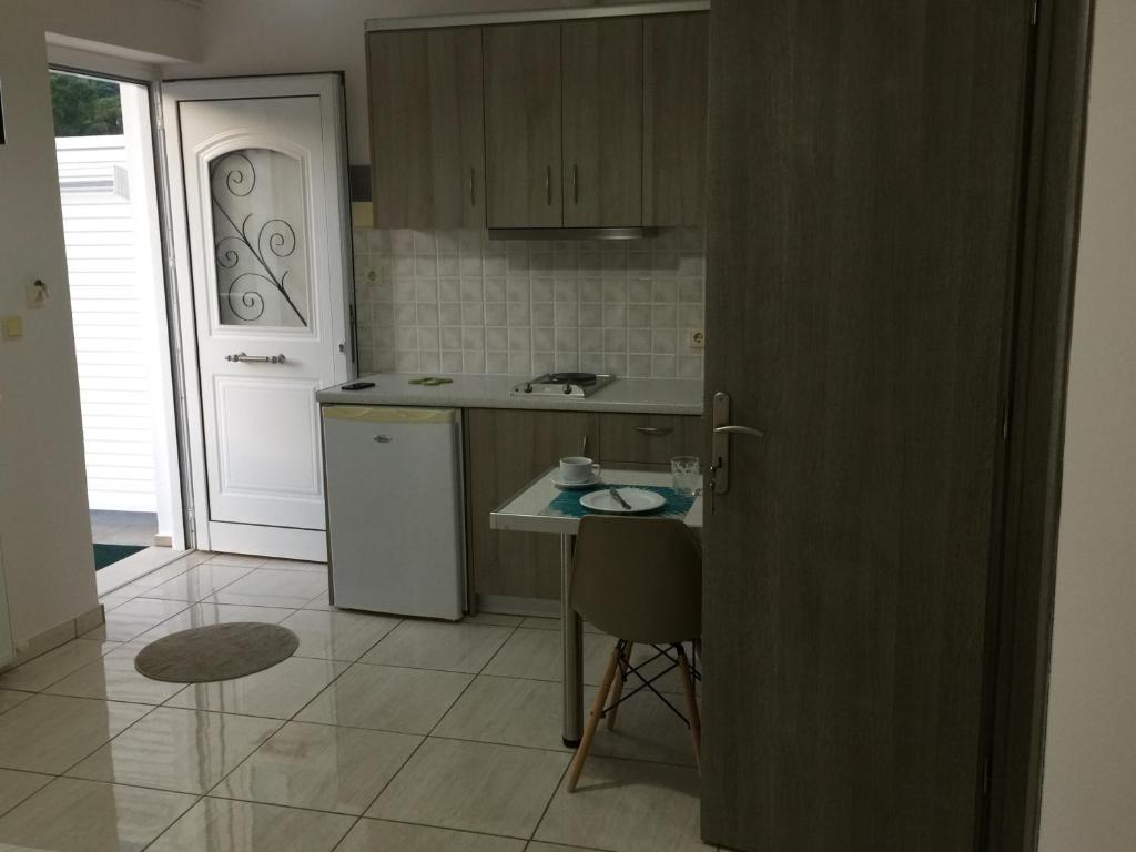 Στούντιο ενός δωματίου με μπάνιο με μεγάλο ντους. Υπάρχει επίσης μια κουζίνα με εσωτερική τραπεζαρία. Υπάρχει ένα κρεβάτι μεγάλου μεγέθους.