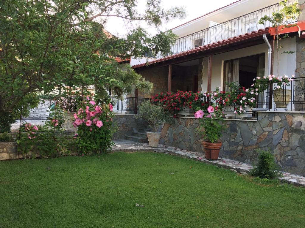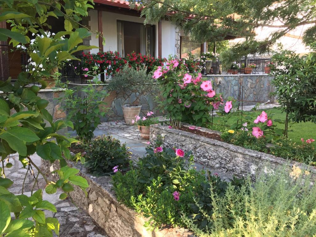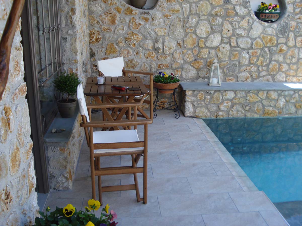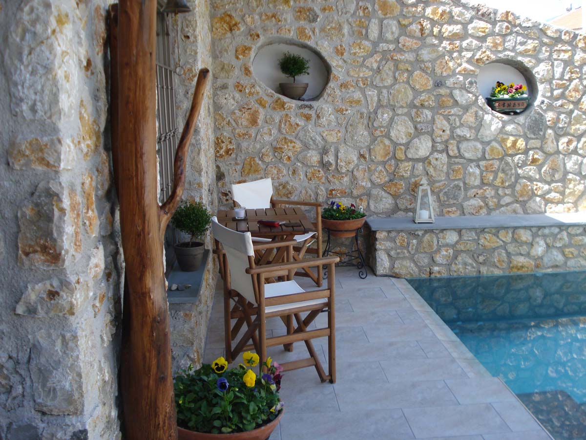 Η Villa Lithos περικλείεται από μια πέτρινη αυλή, διακοσμημένη με λουλούδια και φυτά που δημιουργούν έναν ελκυστικό χώρο για να χαλαρώσετε και να απολαύσετε το Ελληνικό καλοκαιρινό κλίμα.